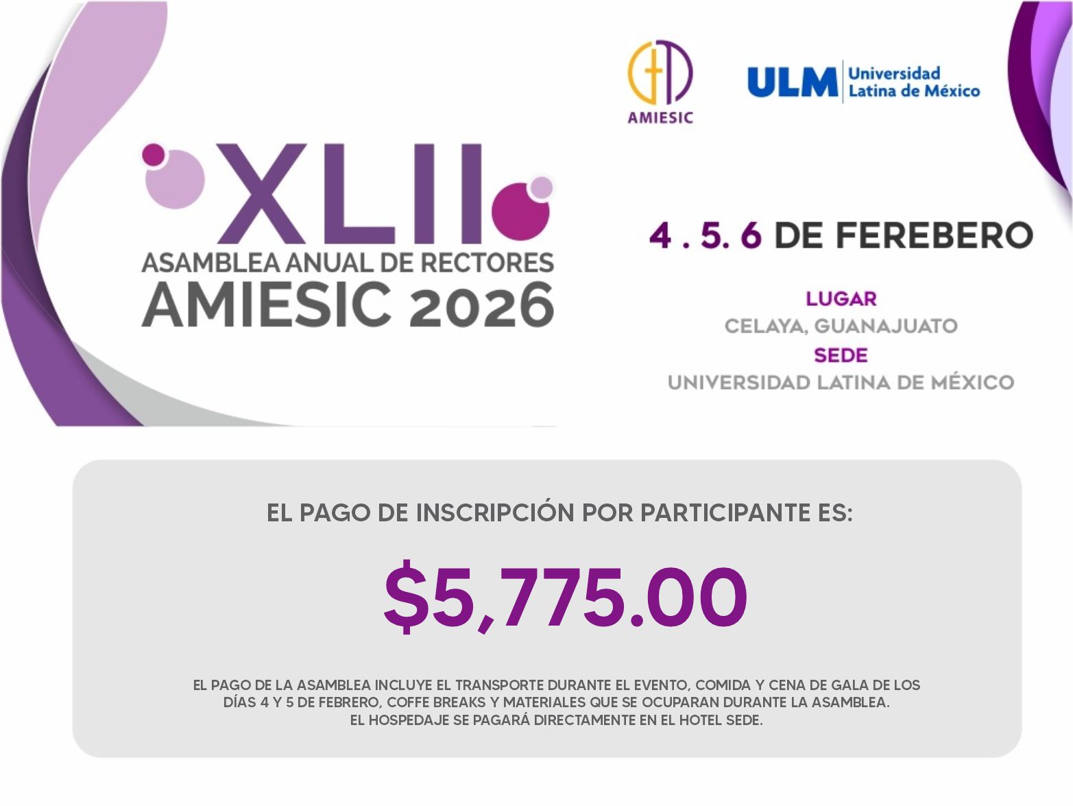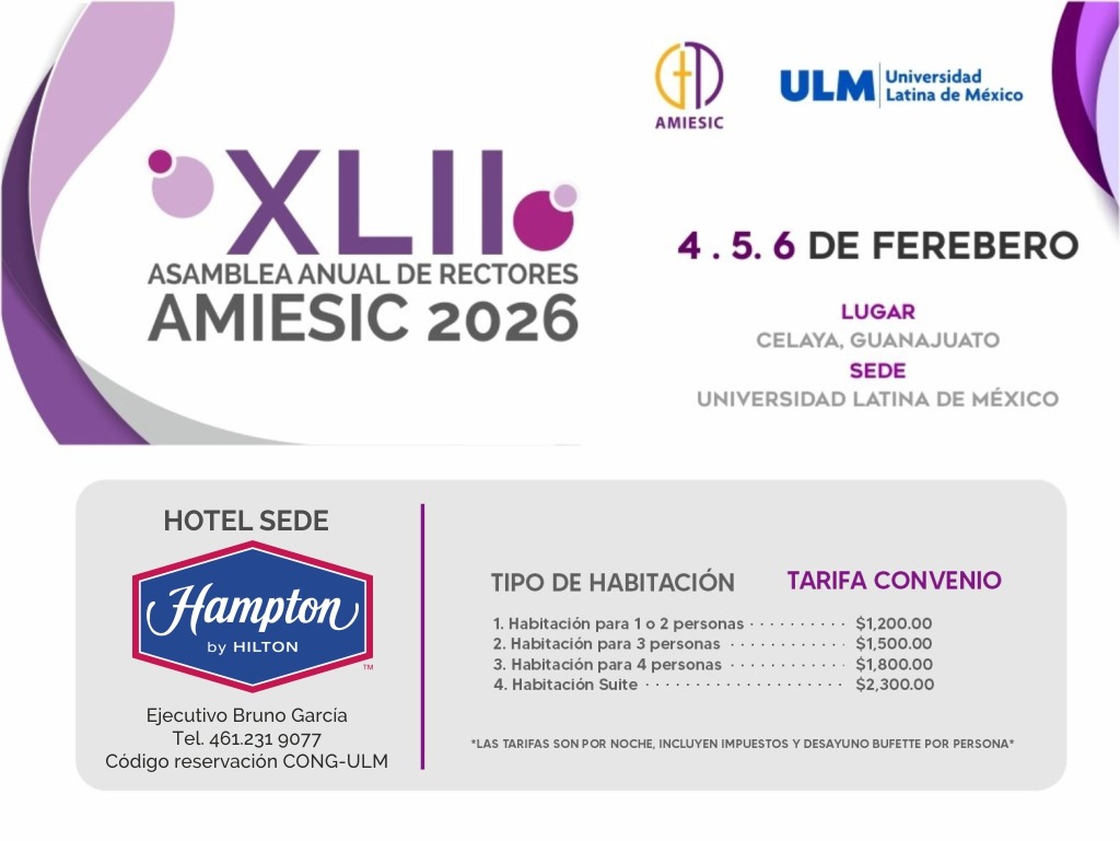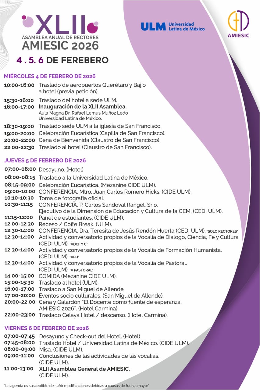Por medio del presente hacemos una atenta y cordial invitación a participar en el XLII Asamblea Anual de Rectoras, Rectores y Vocalías de Dialogo, Ciencia, Fe y Cultura; Vocalía de Formación Humanista; Vocalía de Pastoral de AMIESIC 2026, el cual se llevará a cabo los días 4, 5 y 6 de febrero en la Universidad Latina de México ubicada en la ciudad de Celaya, Guanajuato.